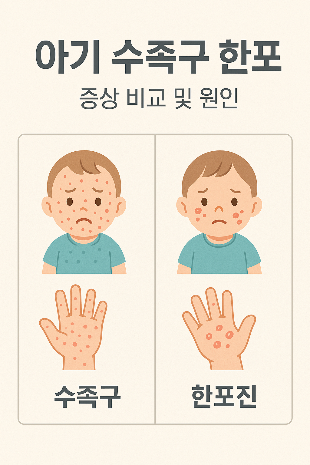 아이 손에 수포가 나타났을 때, 수족구인지 한포진인지 구분하기 어려워 혼란스러울 수 있습니다. 두 질환의 주요 증상을 비교하여 정확하게 구별해 보겠습니다.